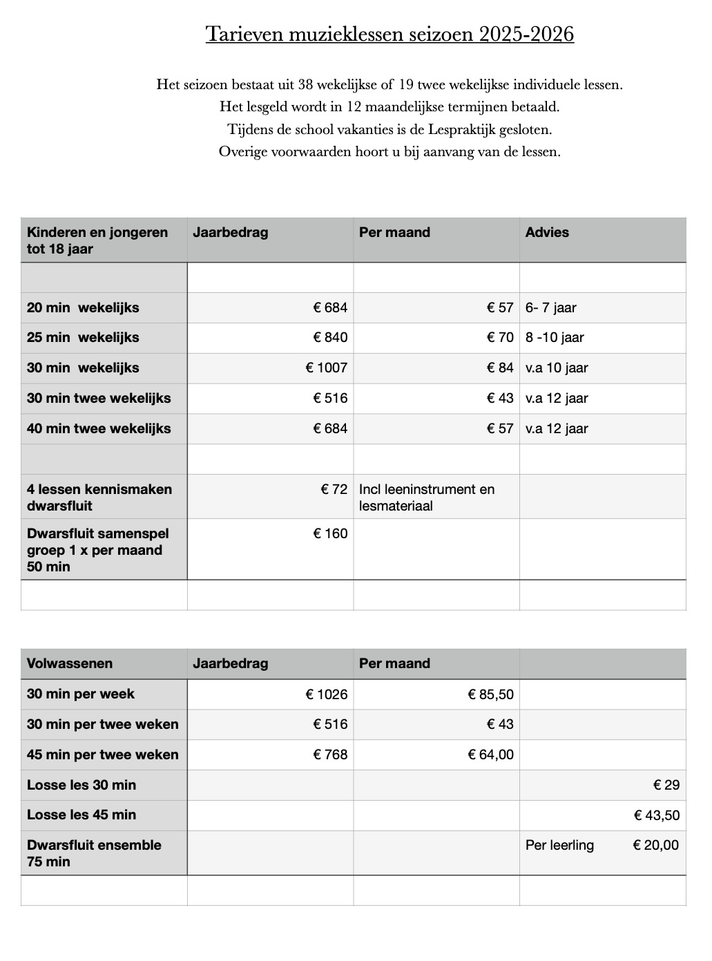 Een lesjaar bestaat uit 38 wekelijkse of 19 twee wekelijkse lessen. Tijdens de schoolvakanties zijn er geen muzieklessen en aan het eind van het seizoen geven de leerlingen een concert.